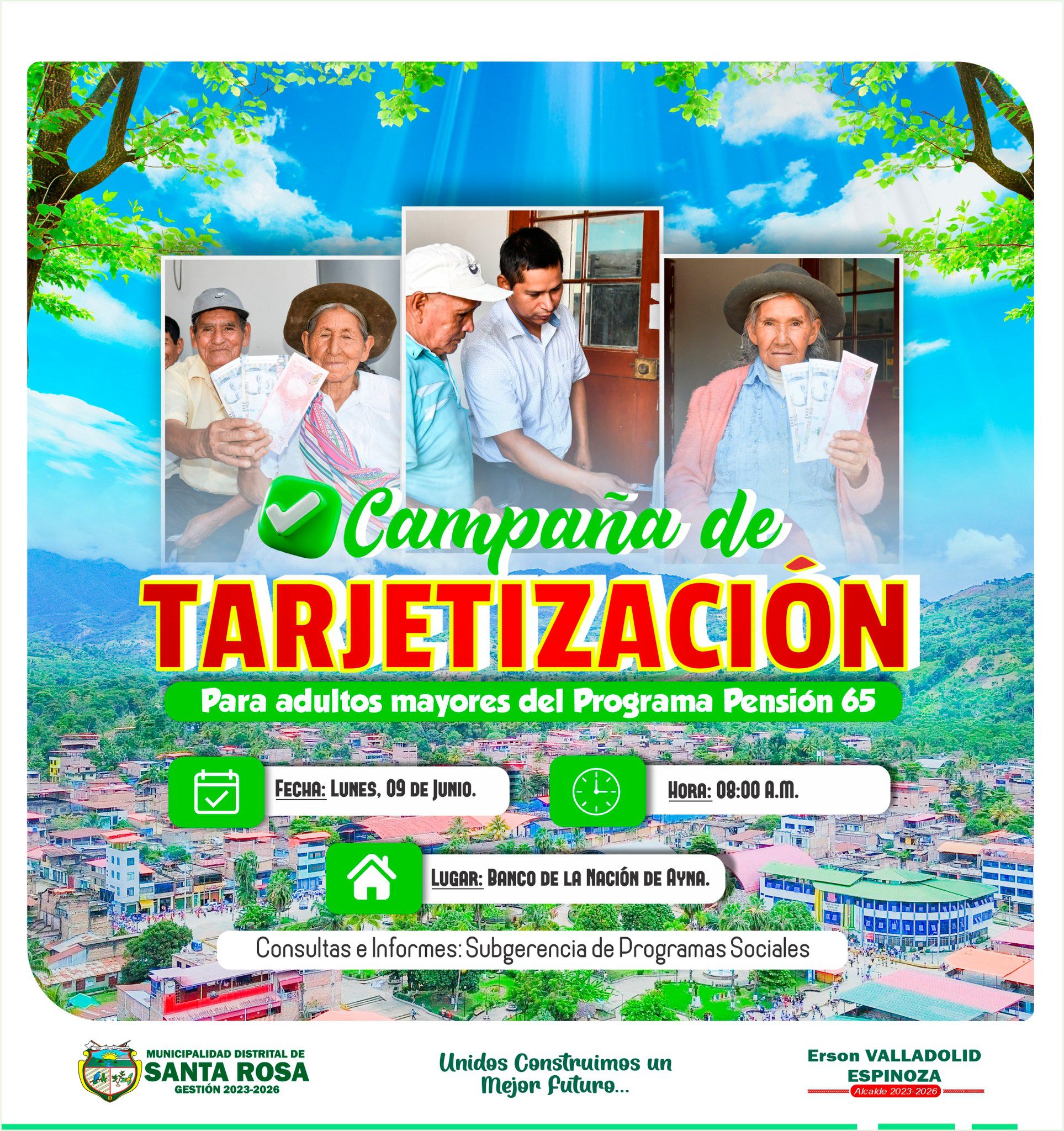 La Municipalidad Distrital de Santa Rosa, a travΓ©s de la Gerencia de Desarrollo Social, informa a los usuarios del Programa PensiΓ³n 65 que aΓΊn no han recibido su tarjeta del Banco de la NaciΓ³n, que pueden participar en la CampaΓ±a de TarjetizaciΓ³n programada para este prΓ³ximo lunes, 09 de junio, a partir de las 08:00 a.m., en el Banco de la NaciΓ³n ubicado en el vecino distrito de Ayna San Francisco.